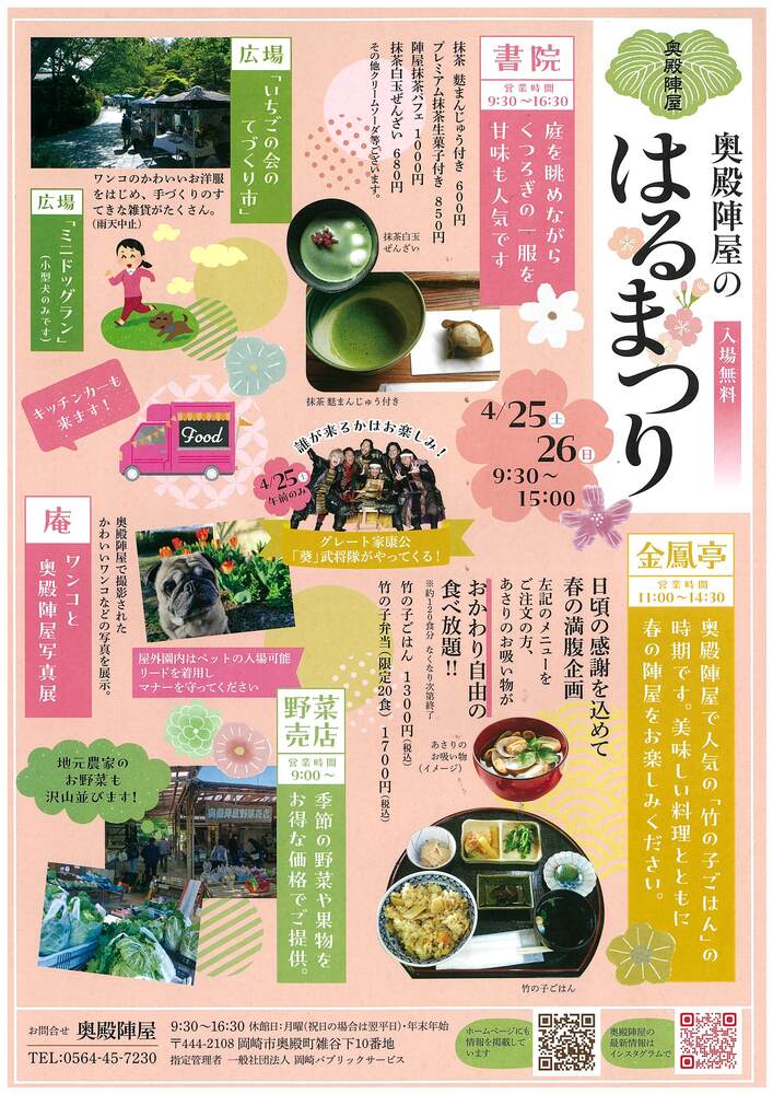 奥殿陣屋のはるまつり ※4/19更新 スケジュール 2026/04/25(土) 09:30 - 11:00 奥殿陣屋 地図を表示 出陣武将:本多忠勝 ※スケジュールは、遠征や撮影、取材対応等の関係で急遽変更となる場合がございます。 奥殿陣屋にて おもてなしをいたします! ~当日の予定~ 9:30 春まつり開始11:00 退陣 ※あくまで予定のため、当日の状況に応じてスケジュールが変わる場合がございます。 どうぞご了承ください。 奥殿陣屋 URLをコピーする 報告する