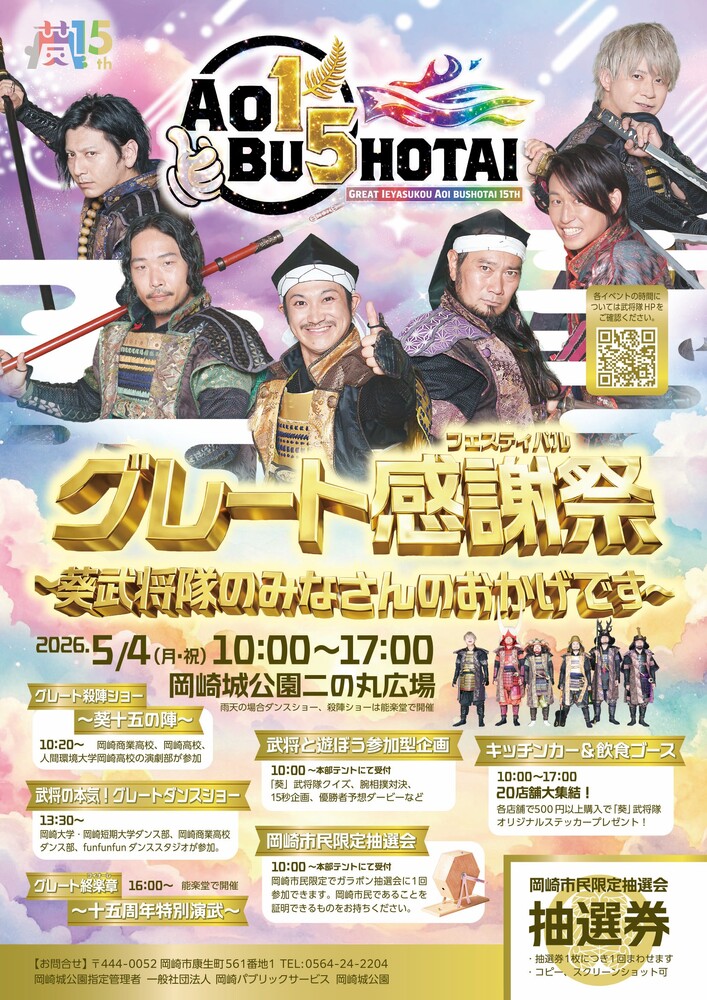 グレート感謝祭(フェスティバル)~葵武将隊のみなさんのおかげです~ スケジュール 2026/05/04(月) 10:00 - 17:00 岡崎城公園 二の丸広場 他 地図を表示 出陣武将:徳川家康、酒井忠次、本多忠勝、榊原康政、井伊直政、服部正成 ※スケジュールは、遠征や撮影、取材対応等の関係で急遽変更となる場合がございます。 岡崎城公園 園内にて グレート感謝祭(フェスティバル)~葵武将隊のみなさんのおかげです~を 開催いたします! 詳しくはこちら! グレート感謝祭(フェスティバル)~葵武将隊のみなさんのおかげです~ URLをコピーする 報告する