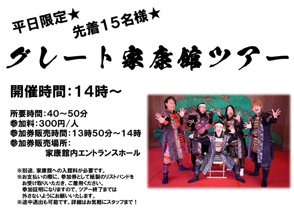 参加料:300円(家康館への入館料は別途必要です。参加証として、紙製リストバンドをお渡しします。)
