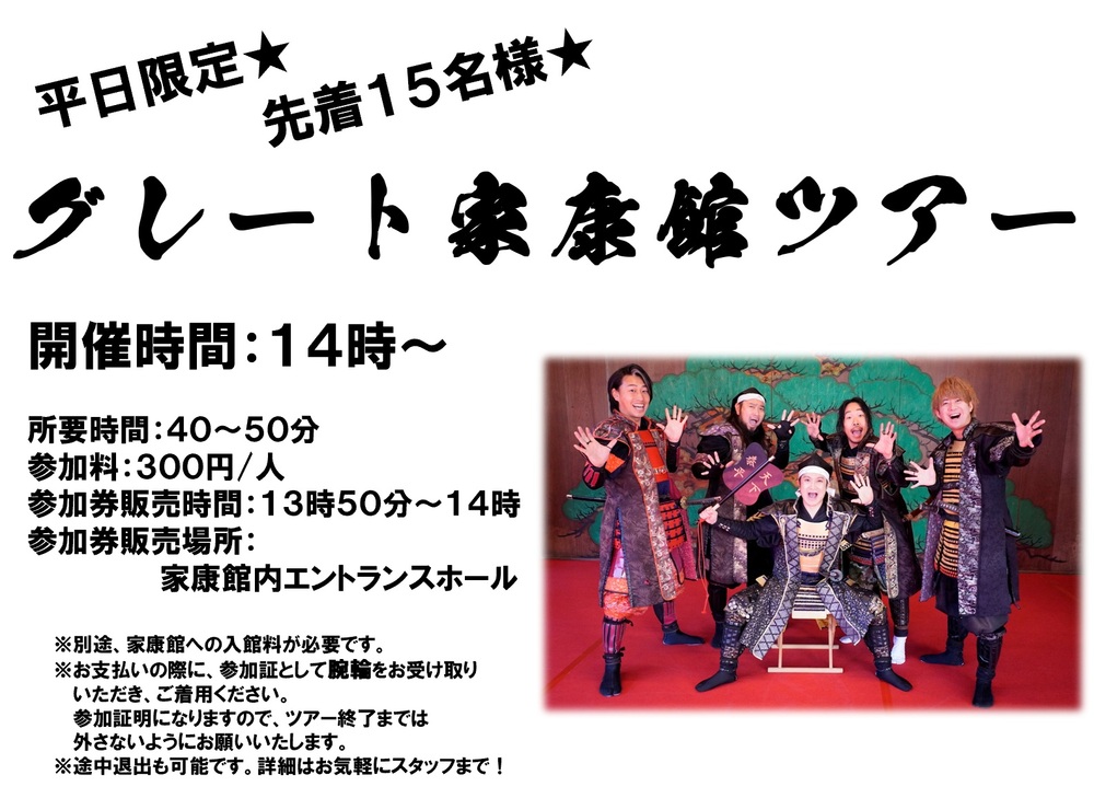 参加料:300円(家康館への入館料は別途必要です。参加証として、紙製リストバンドをお渡しします。)