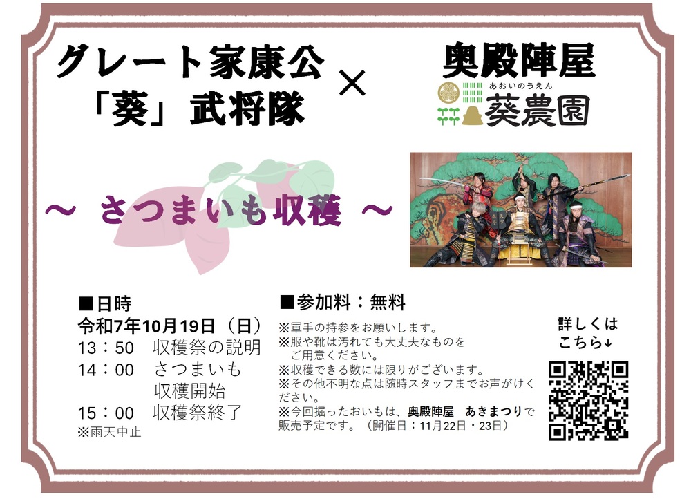 ⭐参加費は無料となります。今回掘ったおいもは奥殿陣屋あきまつり(11/22、23開催)にて販売予定です。